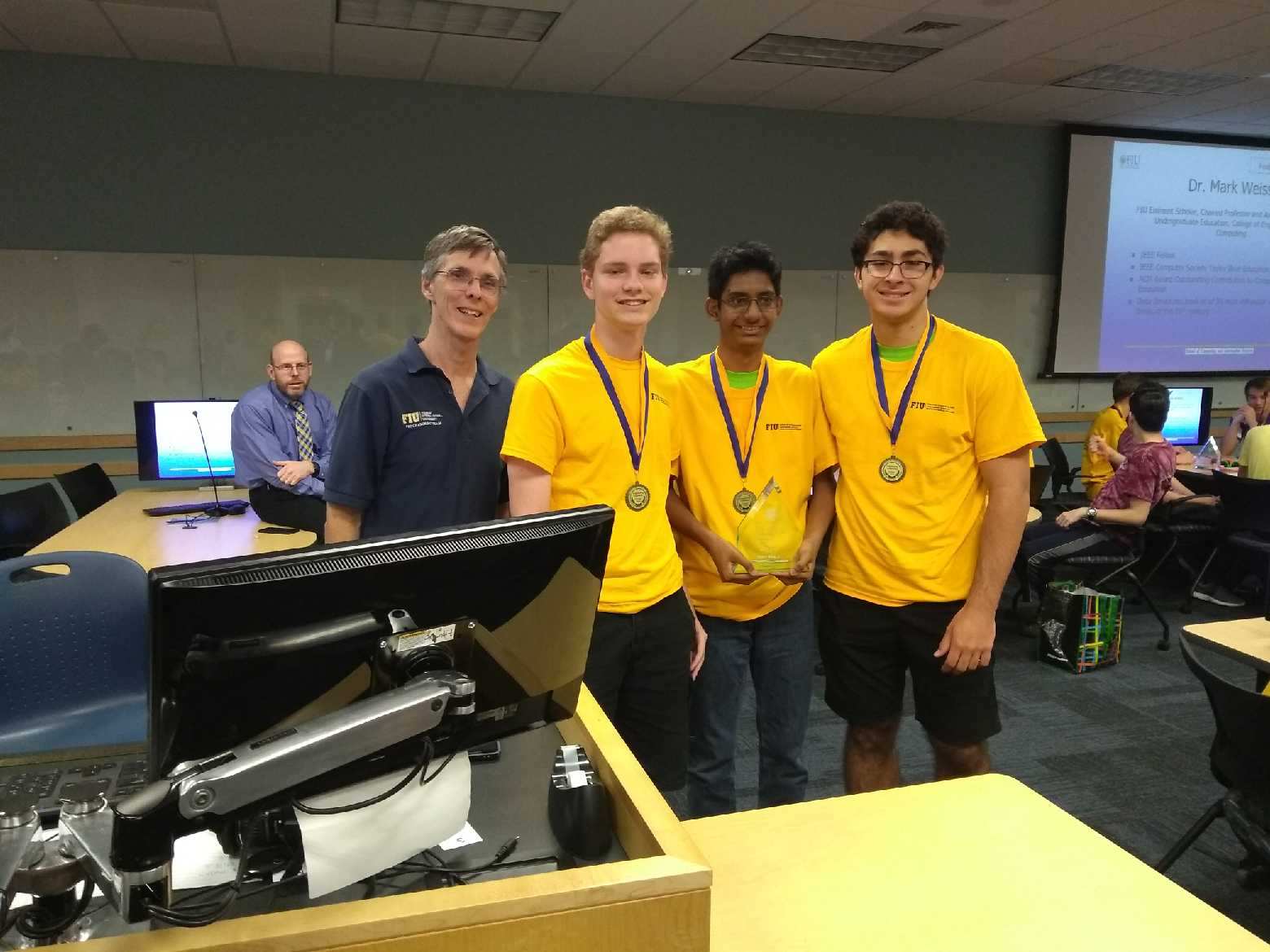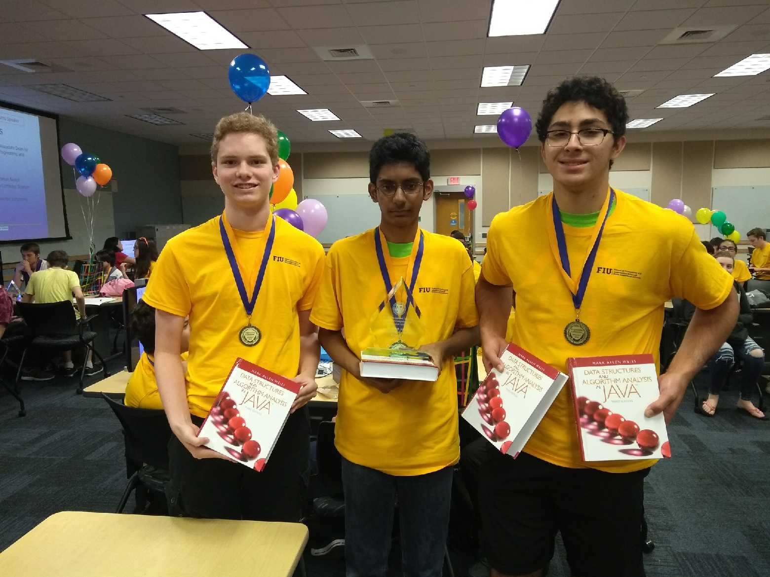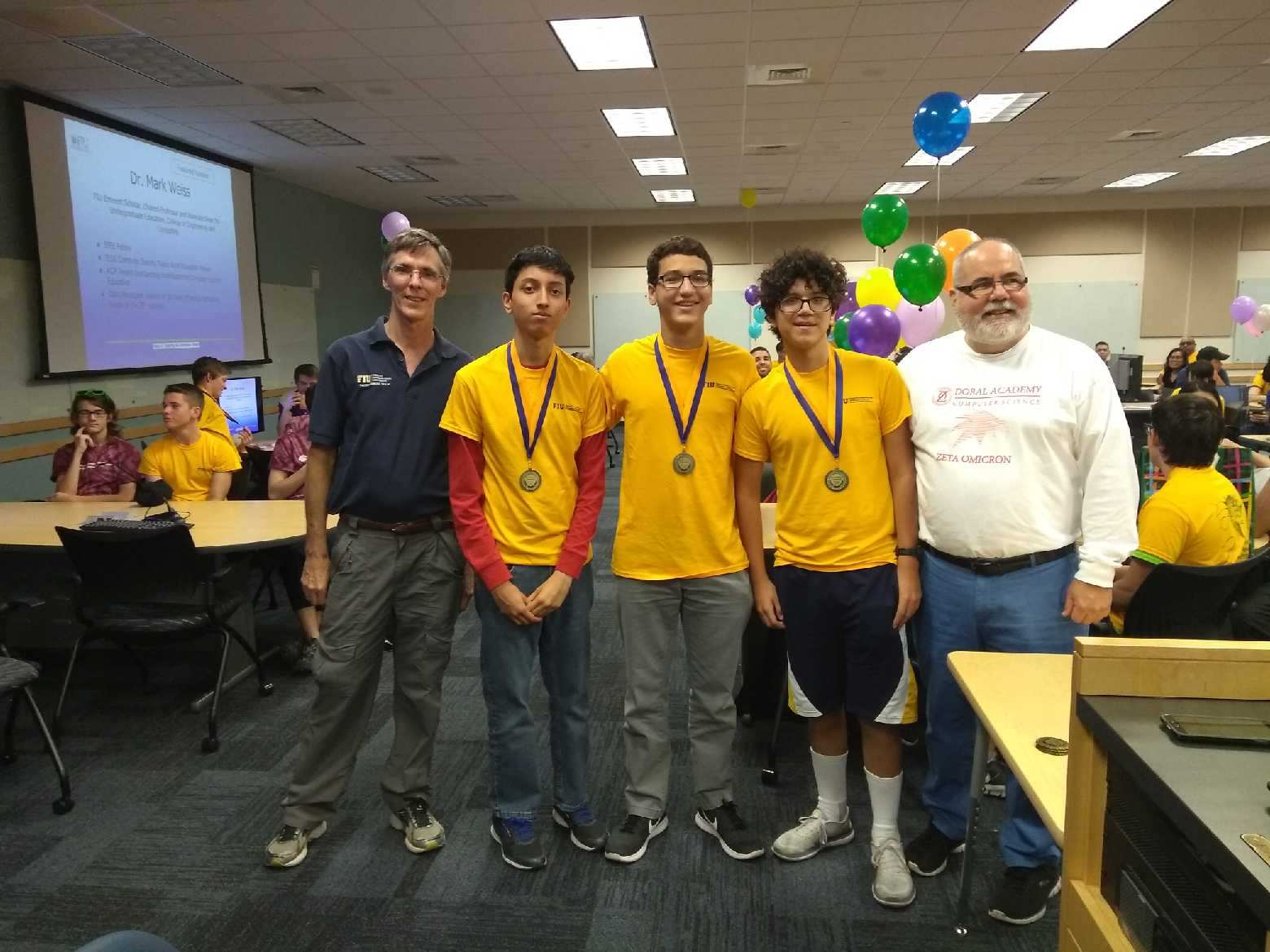 It’s really amazing that Cypress Bay High School’s team was able to solve 10 difficult problems in only 4 hours. And Doral Academy solved 9 problems. The problems required the kinds of algorithms taught in Data Structures here at FIU (weighted shortest path, spanning trees, dynamic programming).