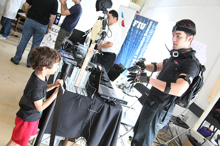 The Miami Maker Faire was held on Saturday, Nov. 16th, 2013 at the Lab Miami, located in the Wynwood Arts District of Downtown Miami. The Faire featured over 80 exhibits, presenters, and workshops and was attend by well over 1,000 people of all ages and interests. Maker Faires are known for their eclectic blending of arts and technology in celebrating innovation, creativity, and the Maker movement. As a sponsor and exhibitor of the Miami Maker Faire, FIU SCIS contributed to the Faire’s success in many ways: